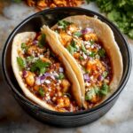 For a festive touch, arrange the tacos standing upright in a deep dish or taco holder. You can also line a serving board with banana leaves or parchment paper and scatter chopped peanuts and fresh herbs around for a fun, vibrant display that invites sharing.