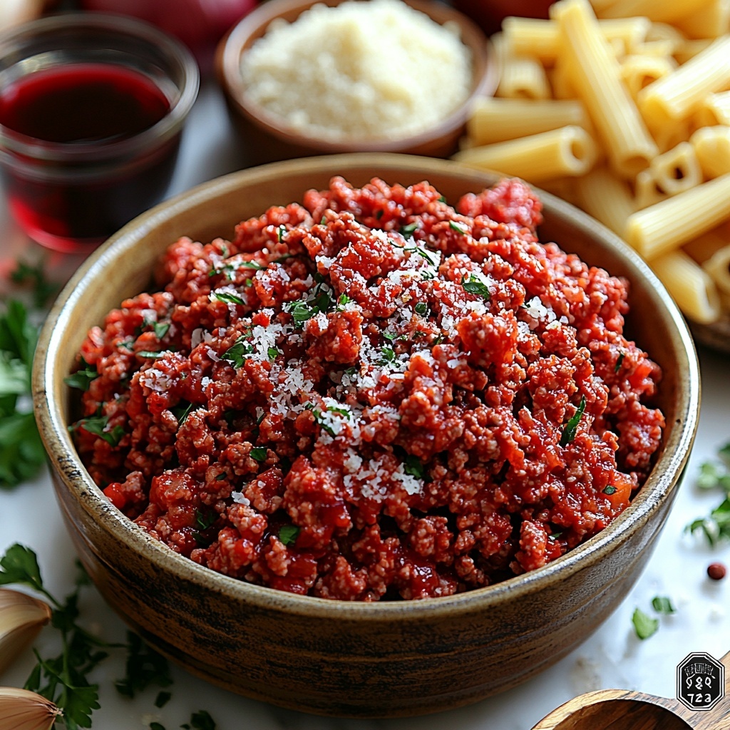 A hearty and flavorful Beef Ragu Pasta recipe featuring tender ground beef simmered in a rich tomato and red wine sauce, served over perfectly cooked rigatoni and topped with Parmesan cheese and fresh parsley.