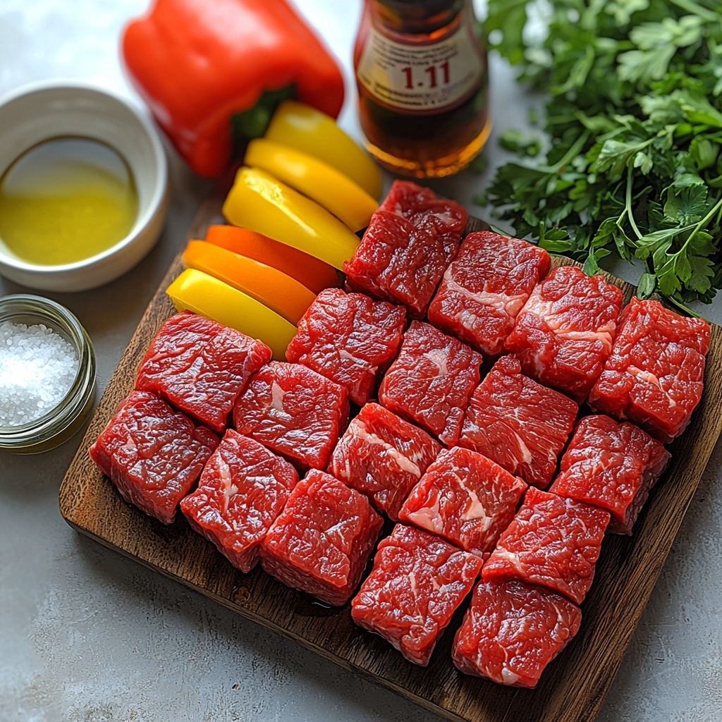Begin by pulling your top sirloin out of the fridge at least 30 minutes prior to cooking to bring the meat to room temperature. This step ensures even cooking. Then, cut the steak into bite-sized pieces and season generously with salt and pepper to highlight the beef’s rich flavor.