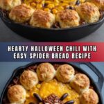 - Serve: Serve the chili hot in bowls or a large cauldron-style pot. Top with shredded cheddar cheese, a dollop of sour cream, and chopped green onions. Arrange the spider breads on the side or creatively on top of the chili for a fun, spooky presentation.