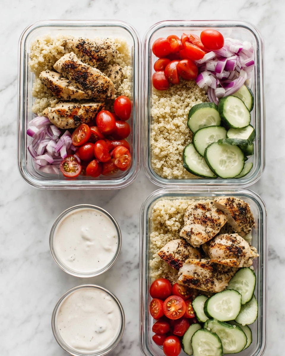 4. Assemble the Bowls: Divide cooled quinoa evenly into four bowls. Top each bowl with grilled chicken skewers, chopped tomatoes, cucumber, red onions, olives, and a generous dollop of tzatziki sauce. Refrigerate assembled bowls for up to 5 days for convenient meal prep.