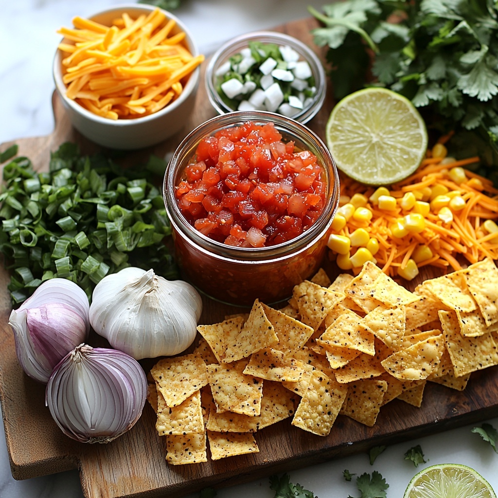 - Sour cream, shredded cheddar cheese, tortilla chips, green onions, and fresh cilantro: Optional toppings that add creaminess, crunch, and fresh herbal notes.