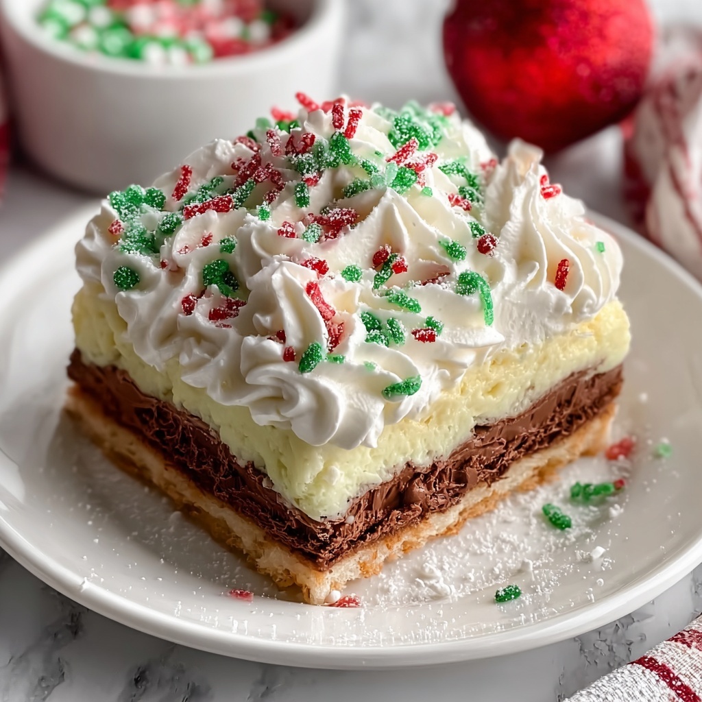 This dessert pairs wonderfully with warm drinks like spiced cider or a cup of peppermint hot chocolate, enhancing the cozy holiday vibe. For a lighter balance, serve alongside a fresh fruit salad with citrus notes to cut through the richness of the layers.