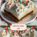 Christmas Cookie Lush is a festive, layered dessert featuring a buttery sugar cookie crust, creamy sweetened cream cheese and whipped topping layer, smooth vanilla pudding, and a final fluffy whipped topping adorned with colorful sprinkles and optional crushed peppermint. Chilled and set to perfection, this no-bake layered treat combines classic holiday flavors and textures, ideal for Christmas parties and holiday gatherings.