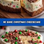 The best way to finish this festive treat is with a generous sprinkle of red and green sprinkles for that cheerful holiday sparkle. For an extra touch of decadence, dot or pipe whipped cream or frosting on top, giving your cheesecake an elegant, snow-capped appearance.