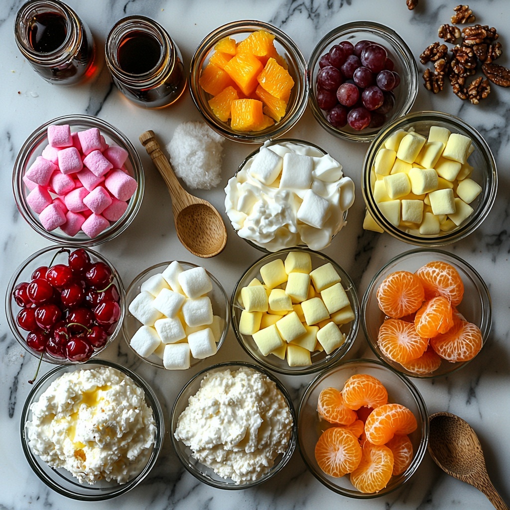 Getting the ingredients right is key to nailing this Classic Ambrosia Salad Recipe. Each component adds its own special flair—from creamy and tangy to sweet and chewy—bringing a burst of color and a layered flavor profile that’s both comforting and playful.