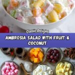 Classic Ambrosia Salad is a refreshing and sweet fruit salad featuring a creamy mixture of whipped topping and Greek yogurt combined with a medley of tropical and citrus fruits, marshmallows, and shredded coconut. Perfect for potlucks, picnics, or a light dessert.