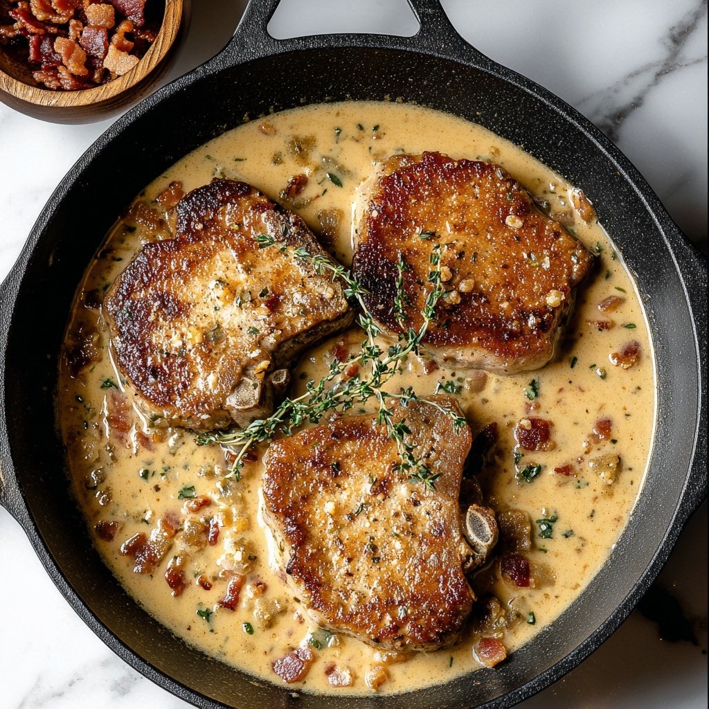 You can serve this dish family-style on a large platter, layering the pork chops and pouring the gravy over them for everyone to share. Or, for a more refined look, plate each chop carefully with a neat drizzle of bacon gravy alongside a scoop of mashed potatoes and a vegetable garnish. Either way, the dish looks as good as it tastes.