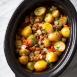 Grab your slow cooker and start layering. Begin with half of the diced potatoes placed evenly on the bottom. Next, spoon half of the cooked beef and vegetable mixture over the potatoes, followed by half of the creamy soup sauce. Repeat this layering process with your remaining potatoes, meat mixture, and sauce — this builds those delicious pockets of flavor throughout the casserole.
