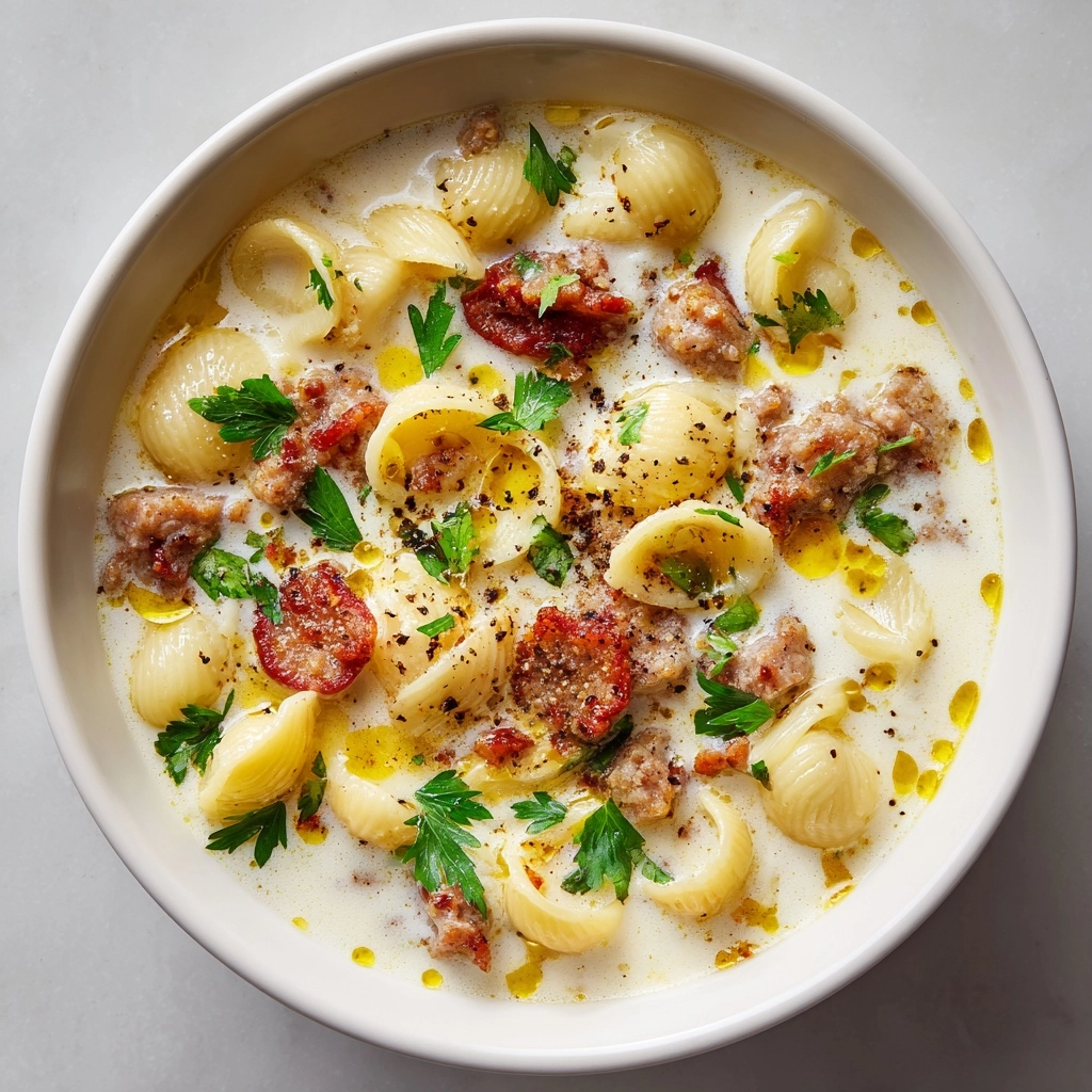 Cozy Ditalini Soup with Creamy Parmesan and Italian Sausage is a comforting Italian-American dish featuring tender pasta, savory Italian sausage, fresh vegetables, and a luscious creamy broth enriched with Parmesan cheese and fresh greens.
