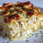 This Creamy Chicken Lasagna with White Sauce is a comforting Italian-American dish featuring layers of tender lasagna noodles, shredded chicken, rich ricotta cheese, and a velvety homemade white sauce seasoned with basil, oregano, and nutmeg. Baked to golden perfection and topped with mozzarella and Parmesan cheese, this lasagna is a delicious and satisfying main course perfect for family dinners or special occasions.