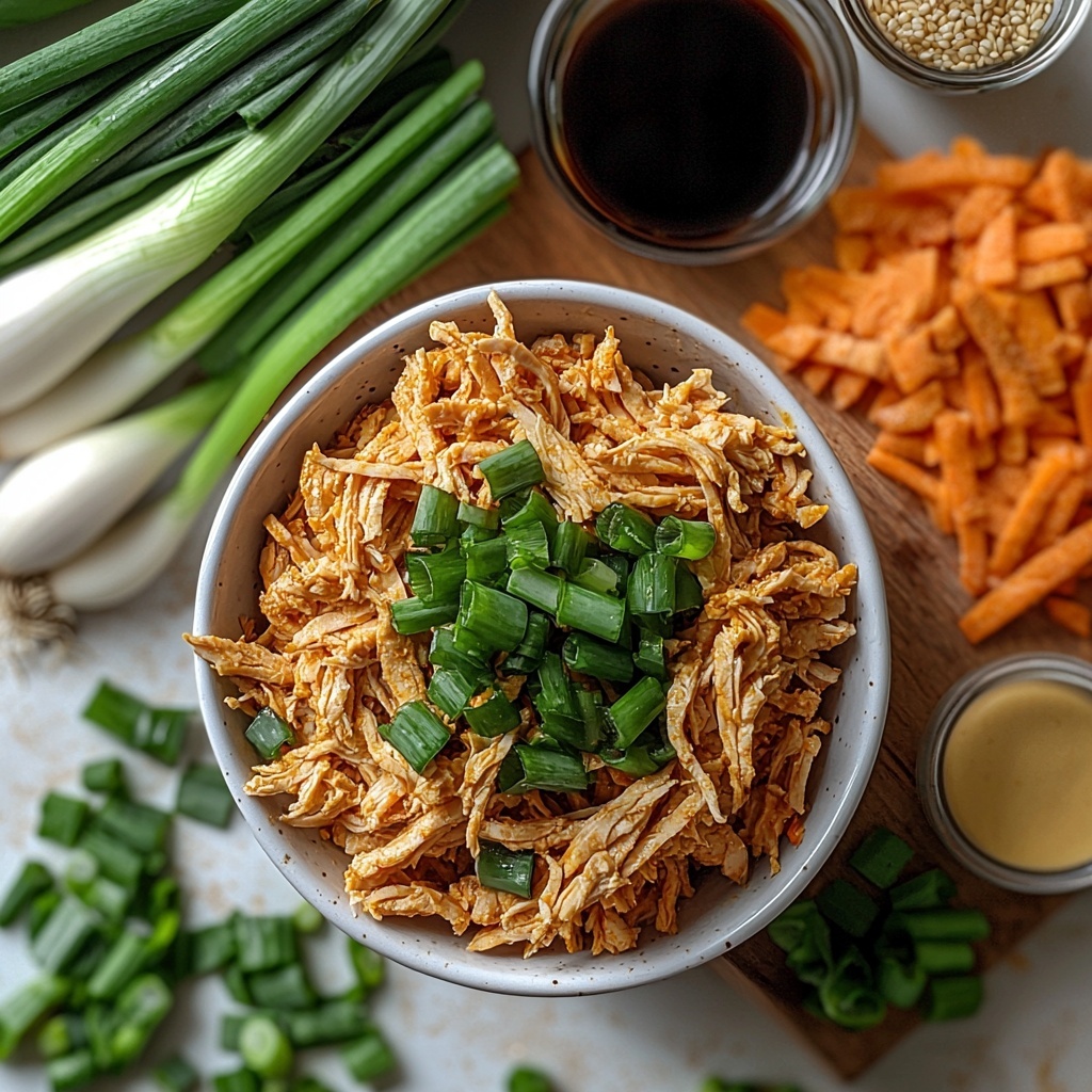 In a roomy bowl, toss together the shredded chicken, cabbage and carrot mix, minced garlic, grated ginger, chopped green onions, soy sauce, and sesame oil. Mixing these ingredients thoroughly ensures every bite bursts with the perfect harmony of flavors and textures.