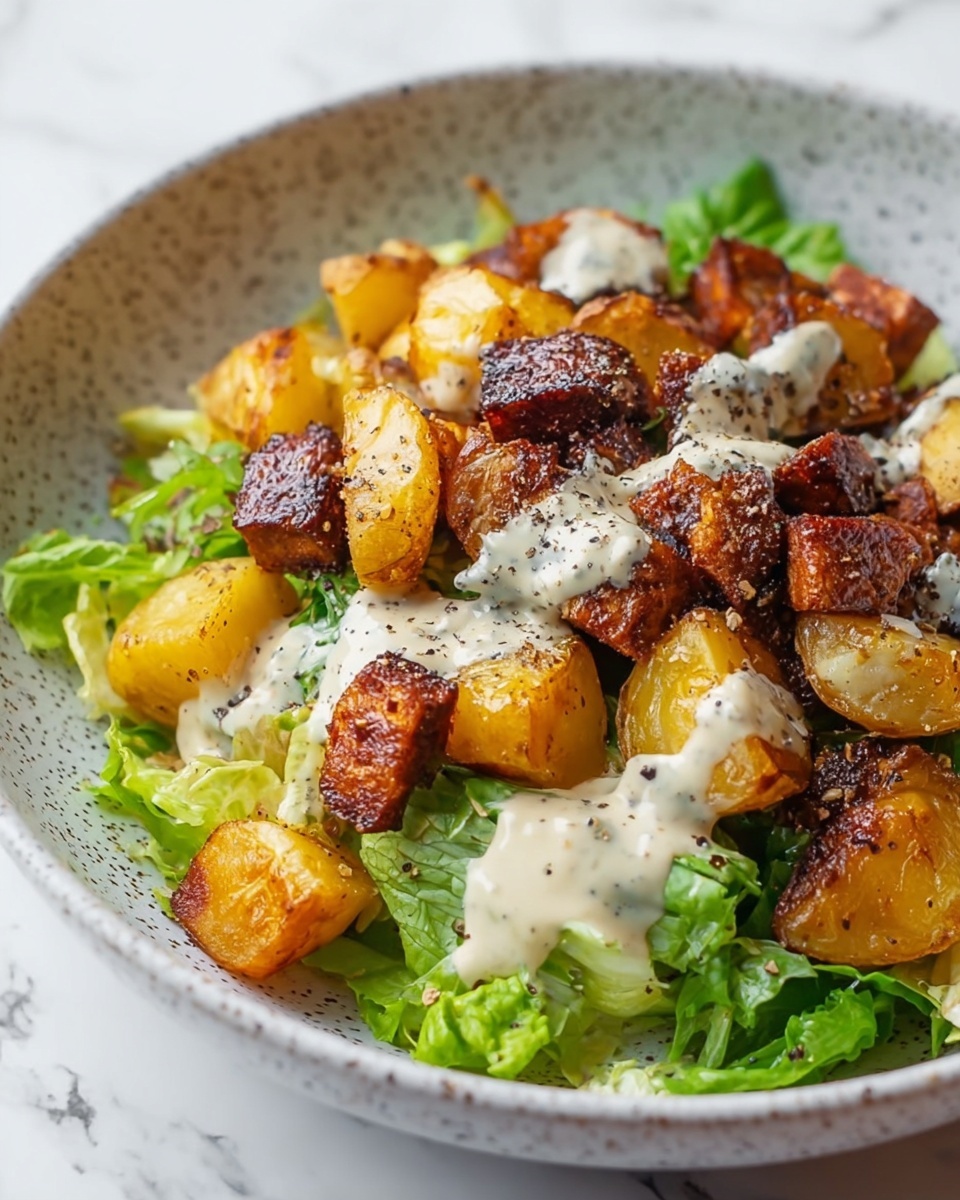 This Crispy Potato Caesar Salad combines golden roasted potatoes with classic Caesar flavors for a unique twist on a traditional salad. The potatoes are seasoned and oven-roasted until crispy, then tossed with crunchy romaine lettuce, creamy Caesar dressing, and grated Parmesan, making it a satisfying side or light meal.