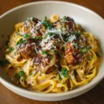This easy garlic butter meatballs recipe served over creamy Parmesan linguine combines tender, flavorful meatballs with a rich and velvety pasta sauce. The dish features perfectly browned meatballs sautéed in garlic butter paired with linguine tossed in a luscious Parmesan cream sauce, making it an ideal comforting Italian-inspired main course for any night of the week.