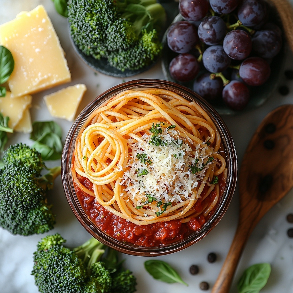 This easy Spaghetti Lunchbox recipe is perfect for a quick, nutritious meal that can be prepared in under 20 minutes. Featuring classic spaghetti tossed with flavorful pasta sauce, topped with Parmesan cheese and accompanied by steamed broccoli and fresh grapes, it offers a balanced combination of carbs, protein, and vitamins ideal for busy weekdays or packed lunches.