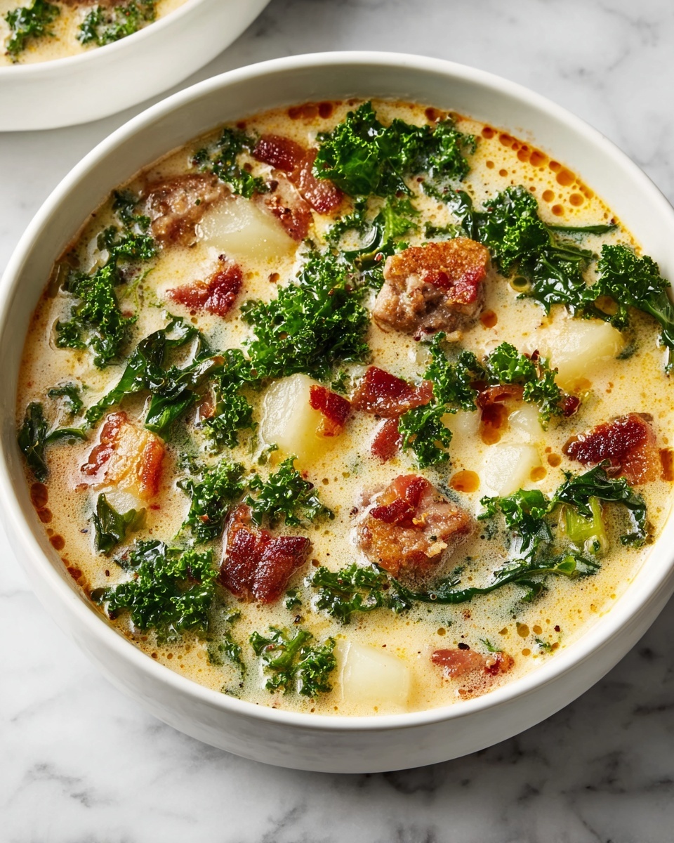 This Easy Zuppa Toscana recipe is a hearty and comforting Italian-inspired soup featuring crispy bacon, savory Italian sausage, tender potatoes, and nutritious kale simmered in a creamy broth. Perfect for a cozy family meal, this soup balances rich flavors with freshness, making it an irresistible classic.