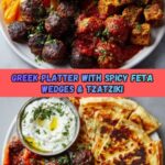 This Greek Platter features crispy spicy feta-topped potato wedges, flavorful Greek meatballs (keftedes), refreshing homemade tzatziki, and toasted pitta bread. Perfect as a main course or an appetizer, this dish combines traditional Mediterranean flavors with simple, wholesome ingredients.