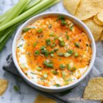 This Greek Yogurt Buffalo Chicken Dip is a creamy, spicy, and tangy appetizer perfect for game days and gatherings. Featuring a healthier twist by using Greek yogurt and cottage cheese, it combines tender shredded chicken with Buffalo sauce, ranch seasoning, and a blend of cheeses, garnished with green onions, blue cheese, and fresh parsley for an added burst of flavor.