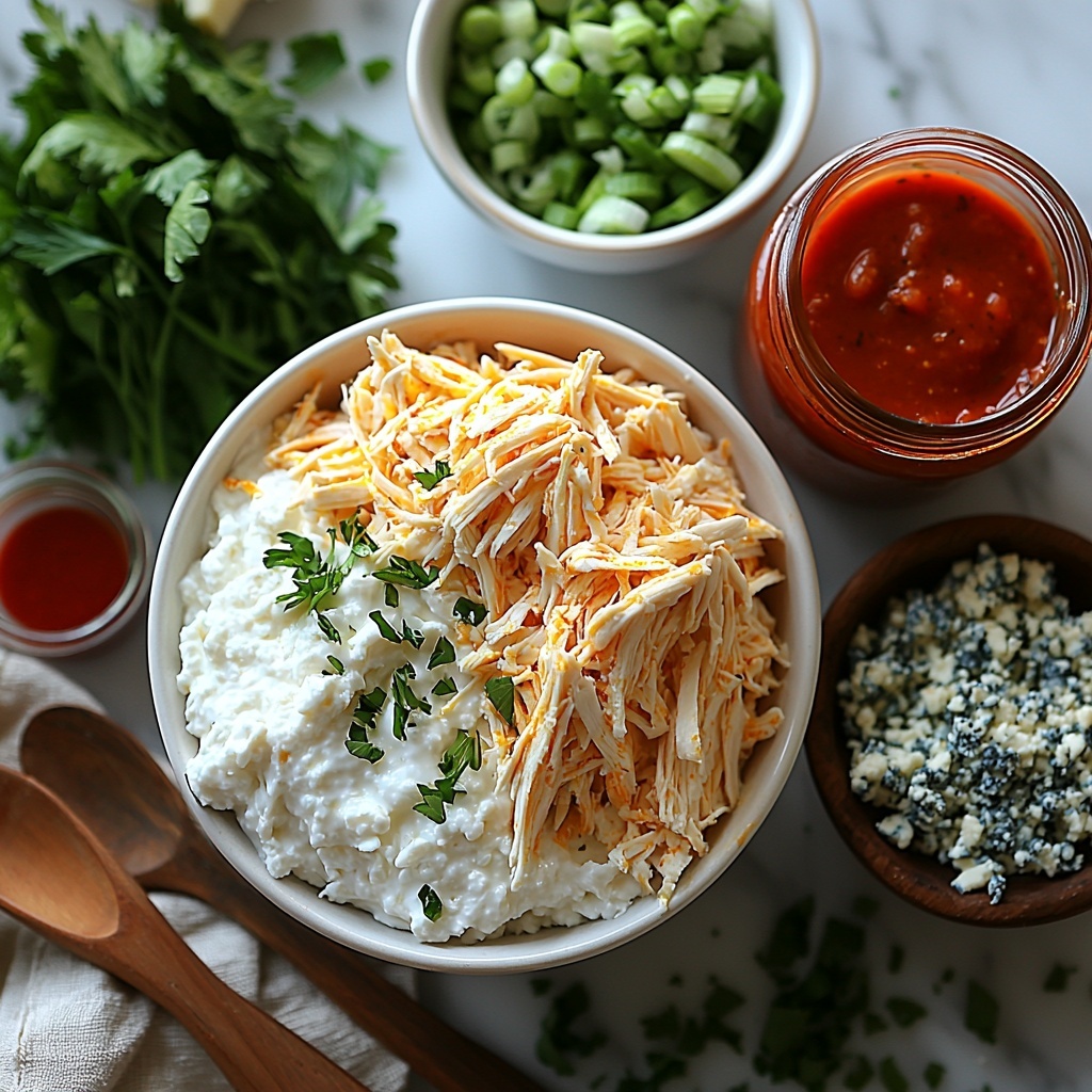 - Mix the Base: In a large bowl, combine the Greek yogurt, cottage cheese, Buffalo sauce, and ranch seasoning. Stir well until the mixture is smooth and evenly blended.