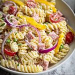 Grinder Pasta Salad is a flavorful and hearty cold pasta dish featuring rotini pasta tossed with a tangy mayonnaise-based dressing and a delicious mix of Italian deli meats, provolone cheese, fresh vegetables, and zesty banana peppers. Perfect as a satisfying lunch or a vibrant side for gatherings, this salad combines a balance of creamy, savory, and tangy notes with a variety of textures.