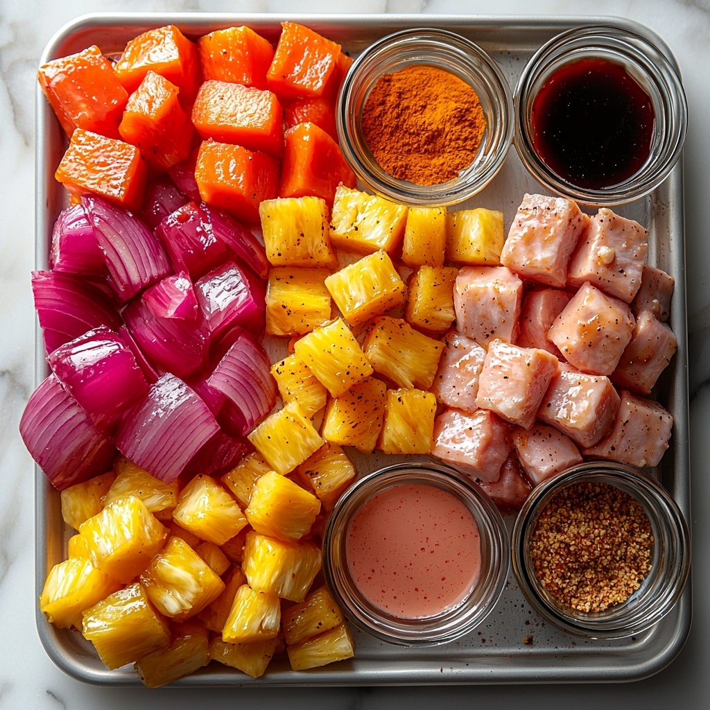 - Combine Main Ingredients: In a large bowl, mix together the chicken cubes, red and yellow bell peppers, red onion wedges, and drained pineapple chunks to evenly distribute the ingredients.