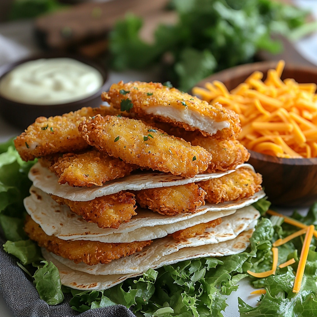 Lay each flour tortilla flat and pile on a generous bed of shredded lettuce. Then place one perfectly cooked chicken tender on the lettuce, followed by a sprinkle of shredded cheddar cheese. Finally, drizzle or spread about a tablespoon of ranch dressing on top. This combination is where all the contrasting textures meet—crisp lettuce, cheesy richness, tangy creamy ranch, and that crispy chicken that’s the real star.