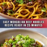 A flavorful and easy-to-make Mongolian Ground Beef Noodles recipe featuring tender lo mein noodles tossed in a savory and sweet sauce with ground beef, garlic, ginger, and green onions, garnished with toasted sesame seeds. Perfect for a quick weeknight dinner that delivers classic Asian-inspired flavors.