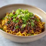 A flavorful and easy-to-make Mongolian Ground Beef Noodles recipe featuring tender lo mein noodles tossed in a savory and sweet sauce with ground beef, garlic, ginger, and green onions, garnished with toasted sesame seeds. Perfect for a quick weeknight dinner that delivers classic Asian-inspired flavors.