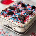 These No Bake Fireworks Oreo Cheesecake Bars combine a crunchy Golden Oreo crust with a creamy, dreamy cream cheese filling loaded with chopped Fireworks Oreo cookies. Topped with festive red, white, and blue sprinkles and optional popping candy, these bars are a fun, colorful, and easy dessert perfect for celebrations and patriotic occasions. No baking required and ready in just a few hours of chilling, they offer both delicious flavor and eye-catching presentation.