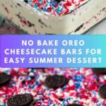 4. Add toppings and serve: Once chilled and set, sprinkle additional chopped Oreo cookies, red, white, and blue sprinkles or candies on top. Optionally, add pop rocks candy for a fun popping sensation. Slice into bars and enjoy your festive no bake Oreo cheesecake bars!