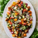 Panzanella is a vibrant Tuscan tomato and bread salad that combines crispy homemade croutons with fresh tomatoes, cucumber, bell pepper, and a tangy vinaigrette. This refreshing salad is perfect for summer and highlights rustic Italian flavors with basil, capers, and optional Parmesan shavings.