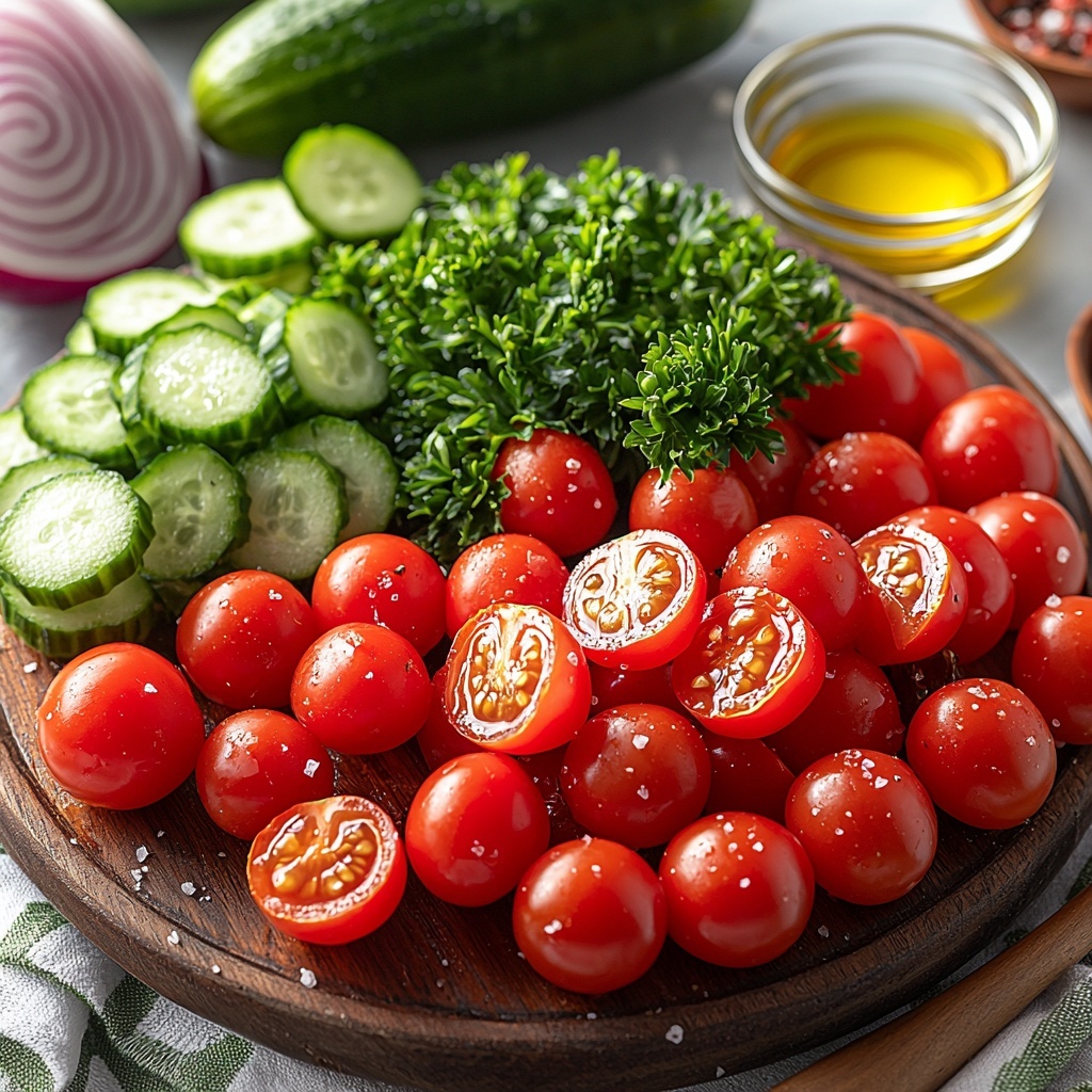 A refreshing and vibrant parsley salad featuring fresh parsley, juicy cherry tomatoes, crisp cucumber, and red onion, tossed in a simple lemon-olive oil dressing. Perfect for a light meal or as a side dish, this salad is quick to prepare and bursting with fresh flavors.