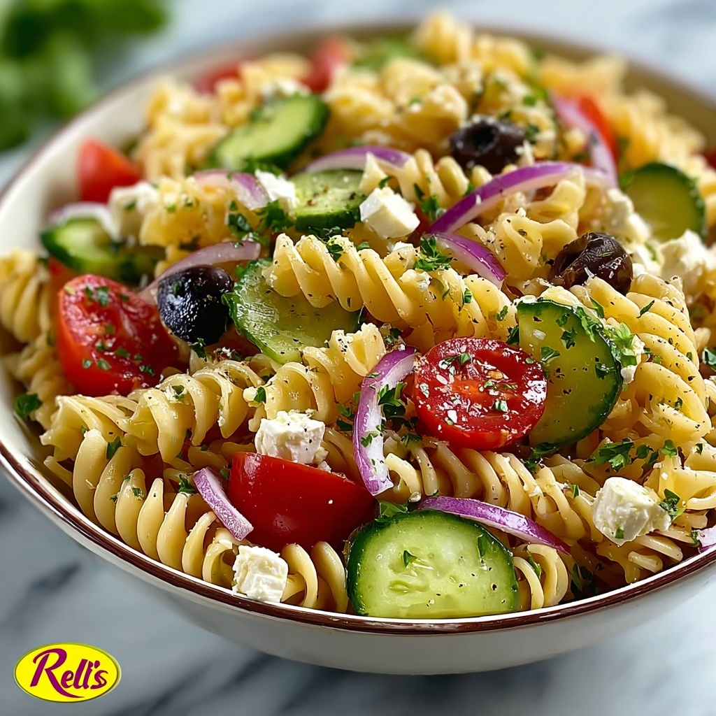 A refreshing and colorful pasta salad featuring rotini pasta tossed with fresh cucumber, grape tomatoes, bell pepper, red onion, and a zesty Italian dressing, topped with crumbled feta cheese and black olives for a perfect blend of tangy and savory flavors. Ideal for quick lunches, picnics, or as a side dish for summer gatherings.