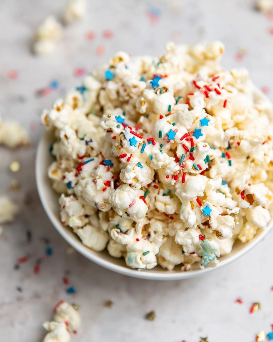 Immediately after tossing, sprinkle your festive red, white, and blue sprinkles generously over the popcorn. This colorful touch not only looks amazing but adds just a bit of sugary texture contrast to the soft marshmallow coating.