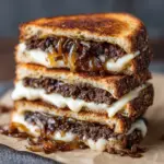 This classic Patty Melt recipe features juicy ground beef patties seasoned with Worcestershire sauce and garlic powder, topped with melted Swiss and cheddar cheese, caramelized onions, and sandwiched between slices of toasted rye bread. Cooked on the stovetop to golden perfection, it’s a perfect diner-style comfort food sandwich that’s delicious and easy to prepare at home.