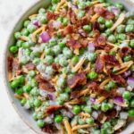 - Assemble the salad: In a large salad bowl, add the drained peas, cooked bacon pieces, chopped red onion, and shredded cheddar cheese. Pour the dressing over the mixture and toss gently to evenly coat all ingredients.