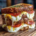 This Pizza Grilled Cheese Sandwich combines the comforting flavors of classic grilled cheese with the savory taste of a pepperoni pizza. Featuring melted mozzarella and Parmesan cheeses, zesty pizza sauce, and crispy pepperoni layered between buttery toasted bread, this easy stovetop recipe is perfect for a quick lunch or a satisfying snack. Serve it warm with extra pizza sauce for dipping to enjoy a gooey, flavorful treat that the whole family will love.