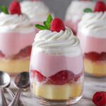 Delightfully light and creamy Raspberry Mousse Cups featuring a luscious raspberry mousse layered over ladyfinger cookies, garnished with fresh raspberries and mint leaves. Perfectly balanced with a touch of lemon and whipped cream, this dessert is elegant yet simple to prepare.