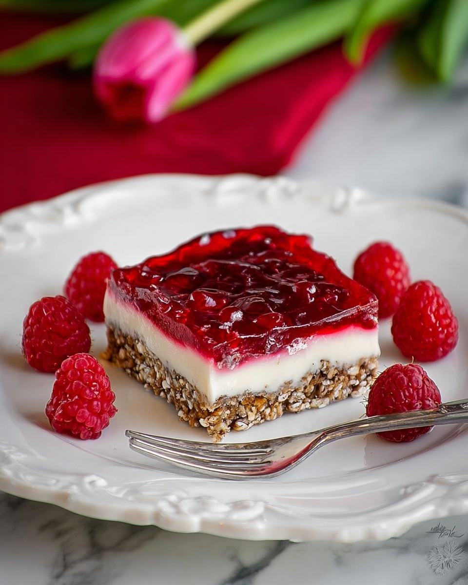 - Add Raspberry Topping: Once the Jello has slightly set, spread the cream cheese and Cool Whip mixture evenly over the Jello layer. Then, sprinkle the thawed raspberries across the top.