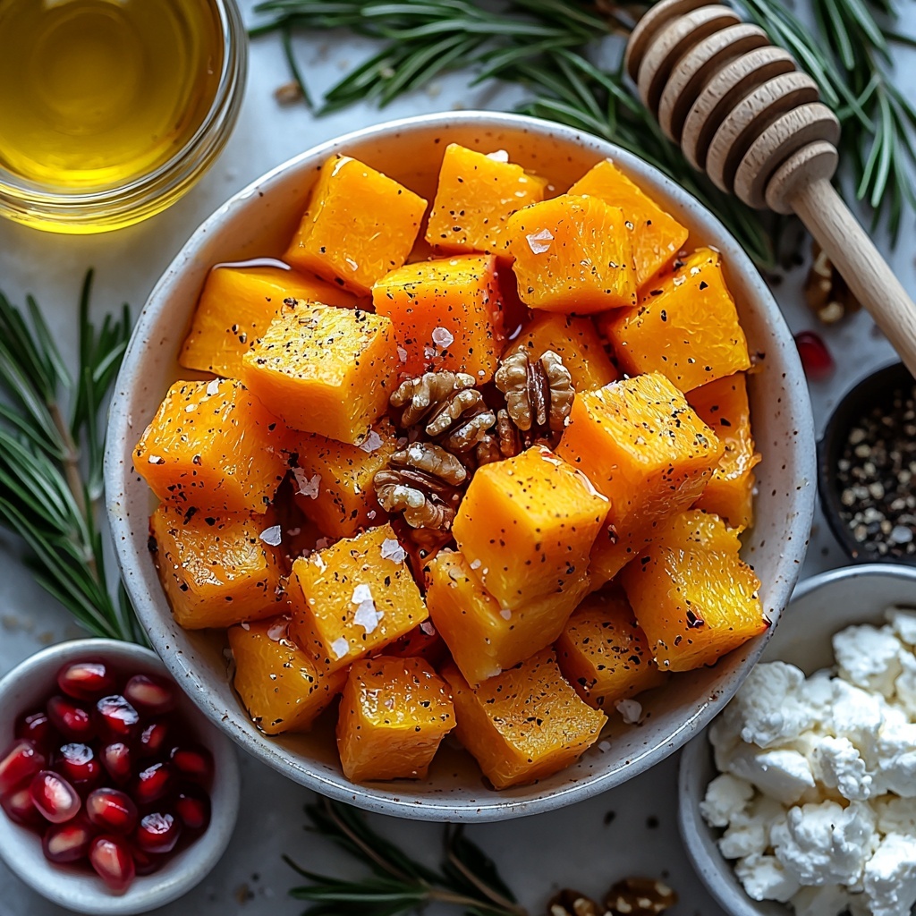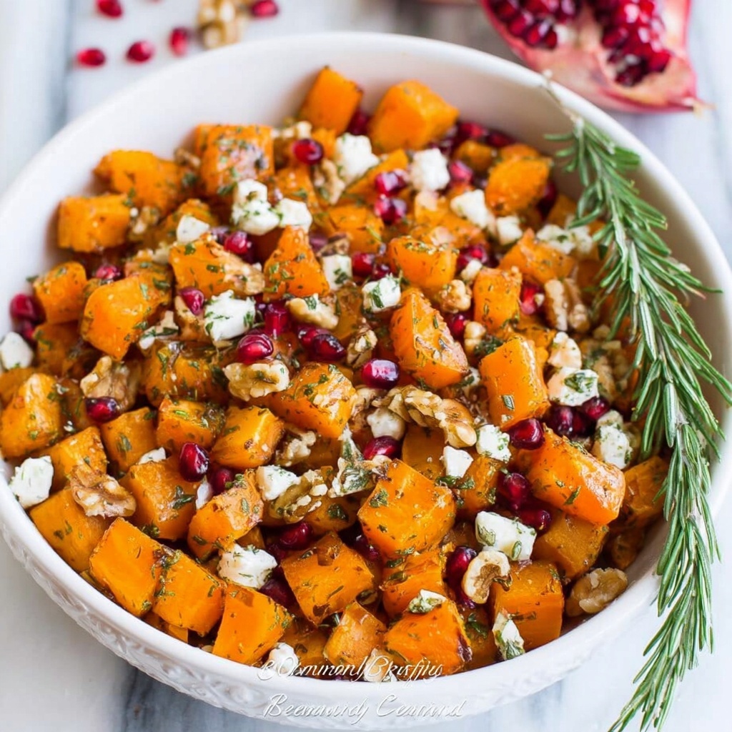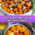 A delicious and vibrant Roasted Butternut Squash with Goat Cheese recipe featuring caramelized squash, crunchy walnuts, fresh rosemary, and sweet pomegranate arils. Perfect as a flavorful side dish or a light vegetarian meal.