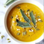 This Roasted Pumpkin Soup recipe is a creamy, comforting fall favorite that combines the natural sweetness of roasted pie pumpkin with aromatic spices and coconut milk for a rich, dairy-free twist. Perfect for chilly days, this soup blends roasted pumpkin with sautéed onion, garlic, and ginger, plus fragrant sage, thyme, cinnamon, and a touch of maple syrup to deepen the flavor. Served with optional crispy sage leaves and roasted pumpkin seeds, it’s a delightfully warming and flavorful appetizer or light meal.