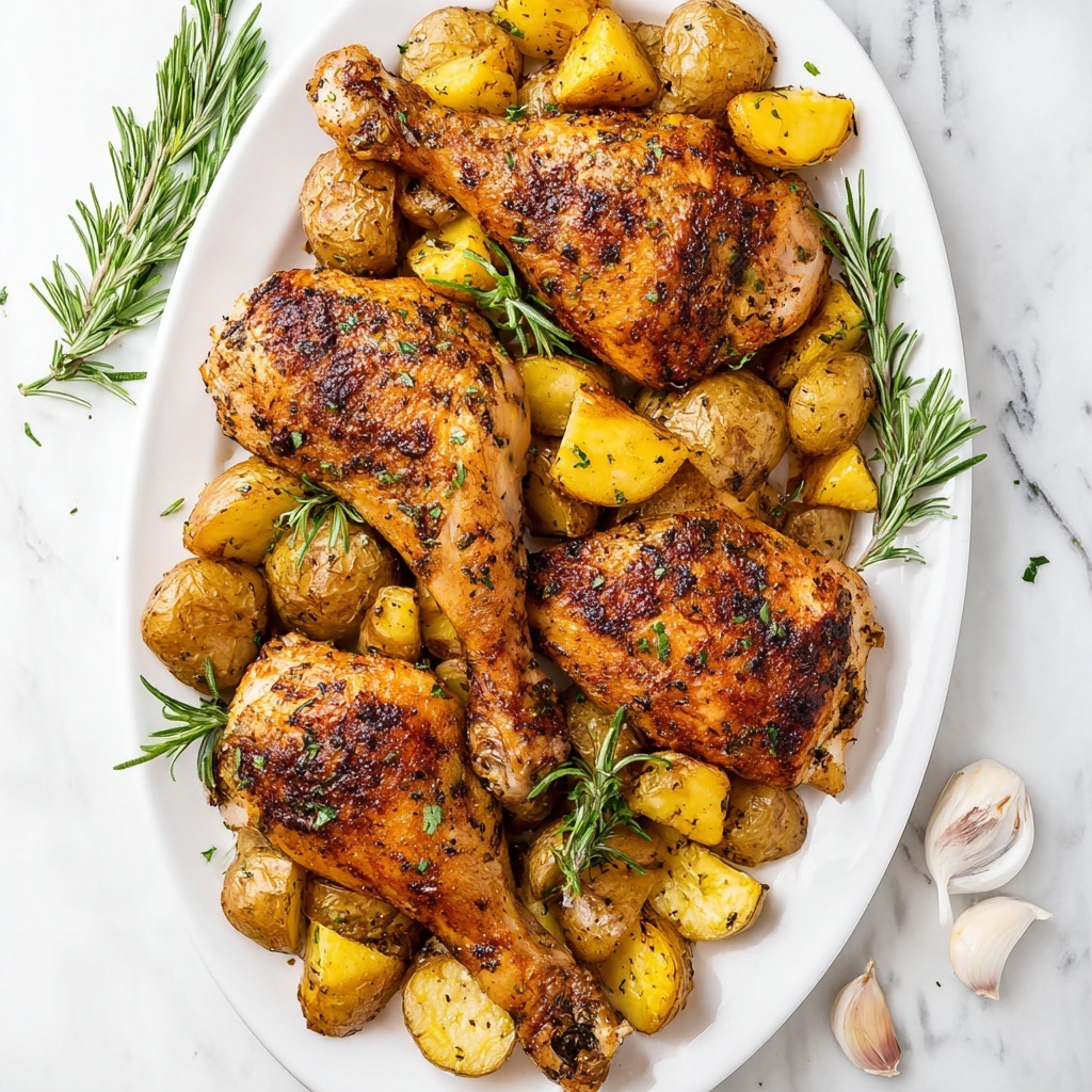 For a crowd-pleasing presentation, arrange the chicken quarters on a large serving platter nestled on a bed of the roasted potatoes. Garnish with rosemary sprigs and lemon wedges for a rustic, inviting look that makes guests eager to dive in.