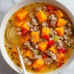 A hearty and comforting sausage and sweet potato soup featuring Italian sausage, vibrant red bell peppers, and tender sweet potatoes, simmered in a flavorful chicken broth base. Perfect for a cozy meal, this soup balances savory and sweet flavors in every bite.