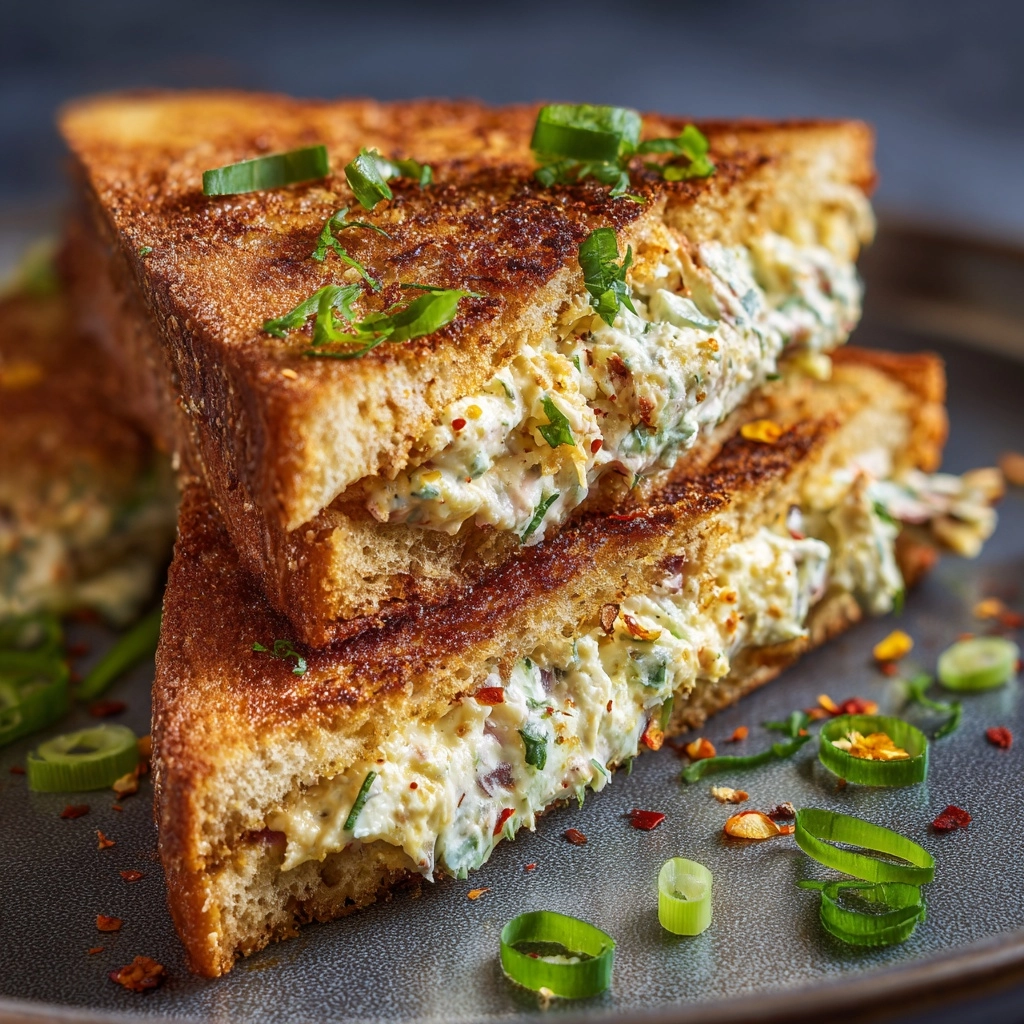 This Spicy Crab Rangoon Melt is a delicious fusion sandwich combining creamy crab rangoon filling with melted cheese, sandwiched between buttery toasted bread. Cream cheese, mayonnaise, sriracha, and aromatic green onions create a spicy, savory mixture enhanced by shredded mozzarella or Monterey Jack cheese and lump crab meat. Quickly pan-toasted to golden perfection, this melt offers a satisfying blend of creamy, cheesy, and mildly spicy flavors perfect for a main course lunch or dinner.