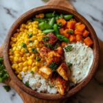 - Assemble the bowls: Divide the cooked jasmine rice evenly into serving bowls. Top each bowl with sliced grilled chicken, the charred corn, a dollop of the mayonnaise and sour cream mixture, crumbled cotija cheese, fresh cilantro, and a squeeze of lime juice to brighten the flavors.