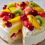 This Tropical Fruit Salad Cheesecake combines a creamy, smooth cheesecake base with vibrant tropical fruits like mango, pineapple, and kiwi for a refreshing twist. Finished with a glossy fruit jam topping and fresh strawberries, it’s a perfect dessert for warm days or special occasions.