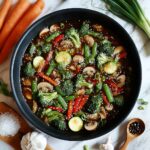 - Add Vegetables: Add bell pepper, broccoli florets, sliced carrots, and sliced mushrooms to the skillet, distributing evenly.